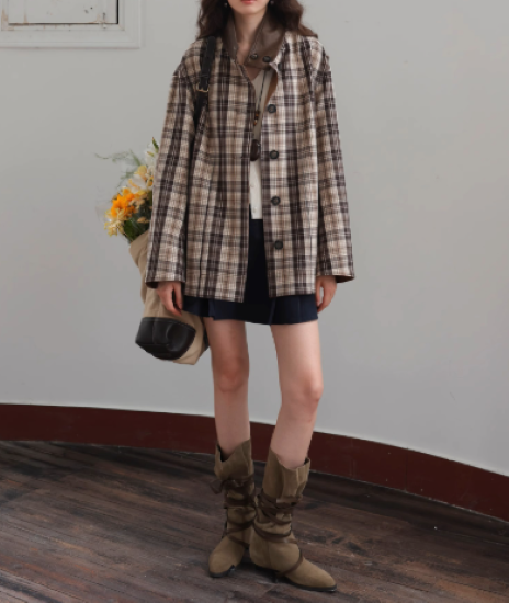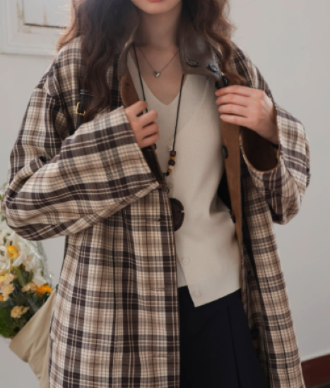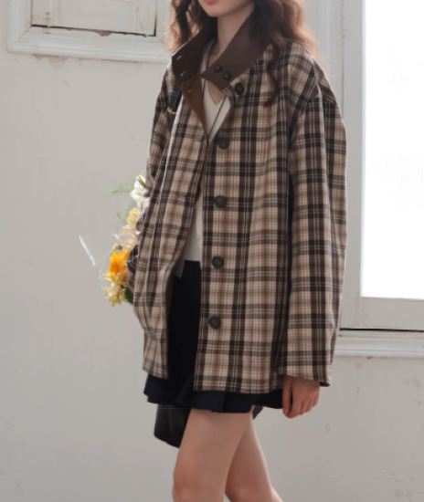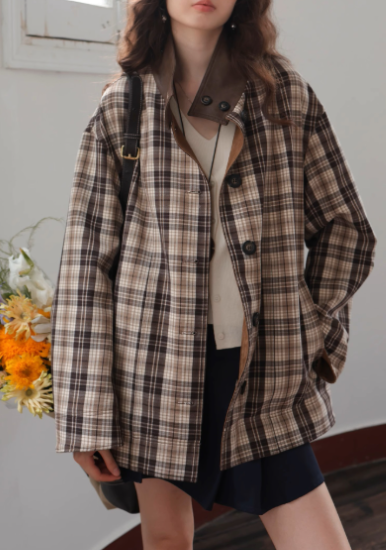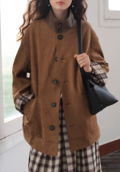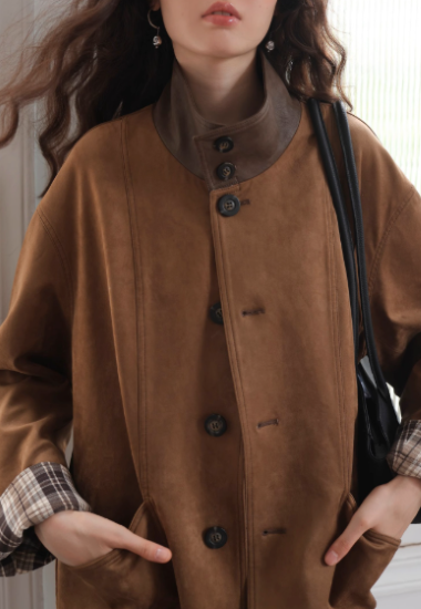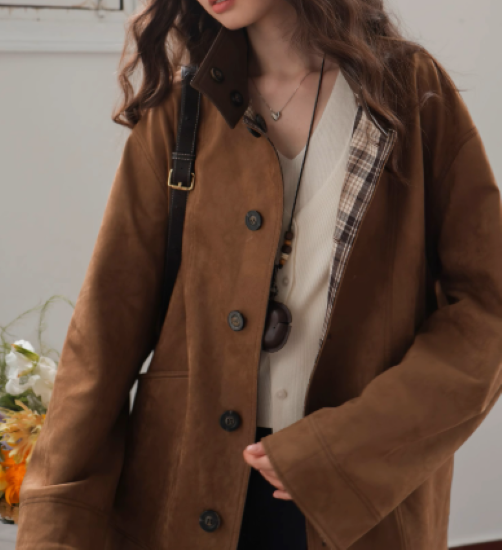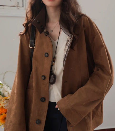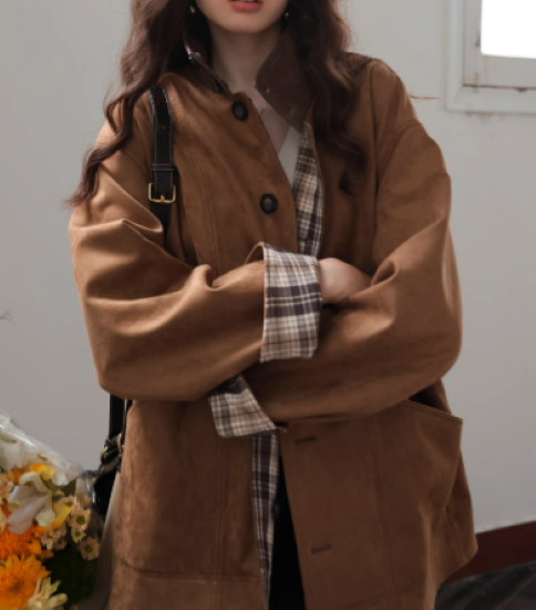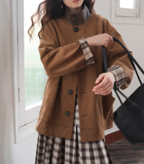 ジャケット レディース アウター 羽織 上着 スエード 長袖 スタンドカラー シンプル 無地 フロントボタン リバーシブル チェック柄 ポケット 秋冬 カジュアル お出かけ おしゃれ ファッション