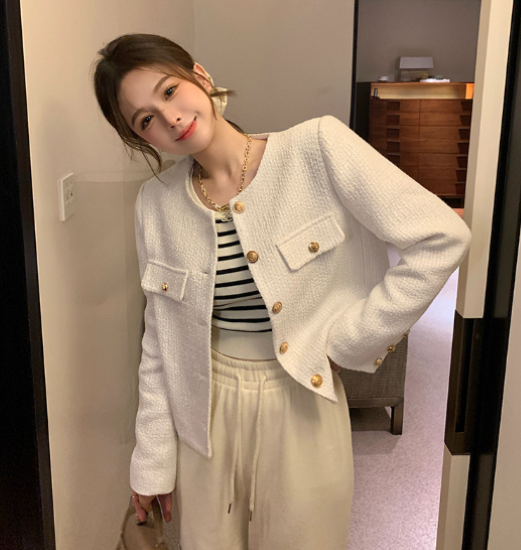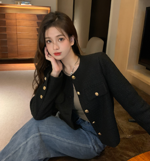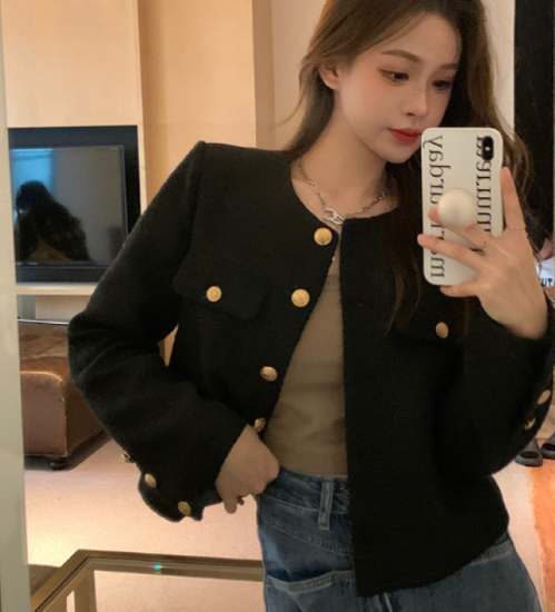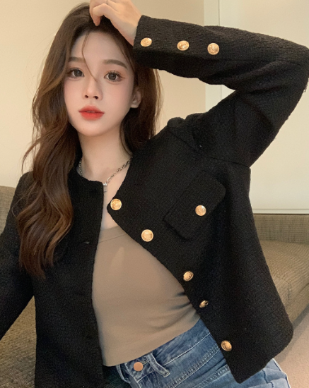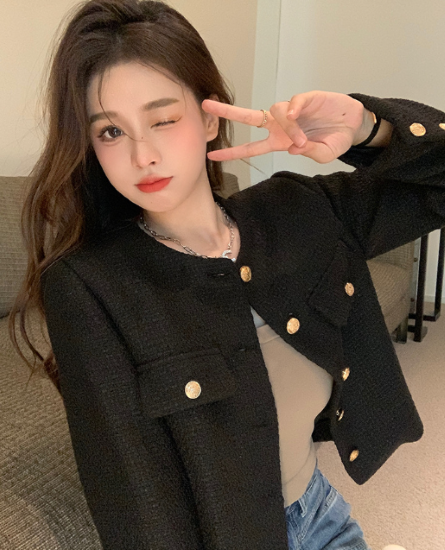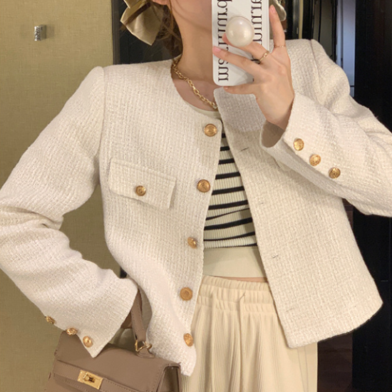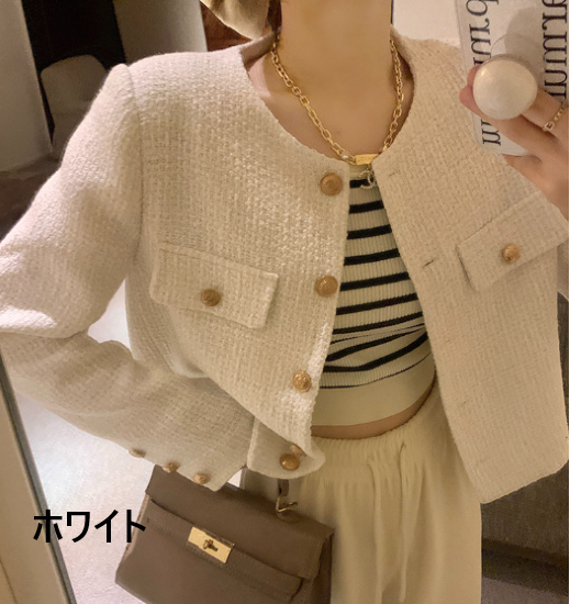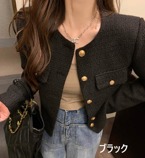 ジャケット レディース アウター 羽織 上着 長袖 ショート丈 ノーカラー フロントボタン ゴールドボタン きれいめ エレガント 上品 大人っぽい フォーマル お呼ばれ カジュアル お出かけ 女性