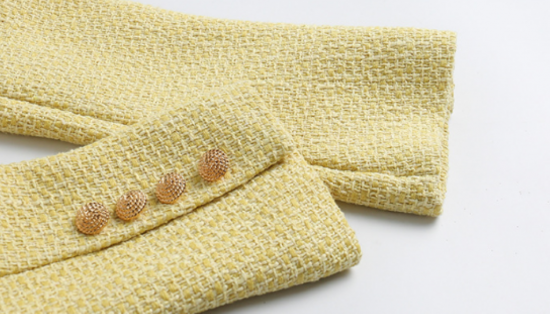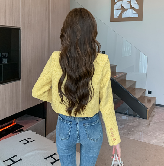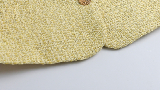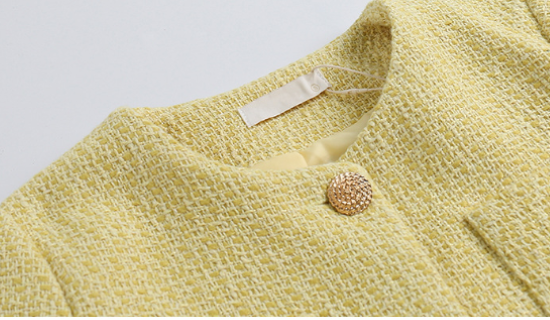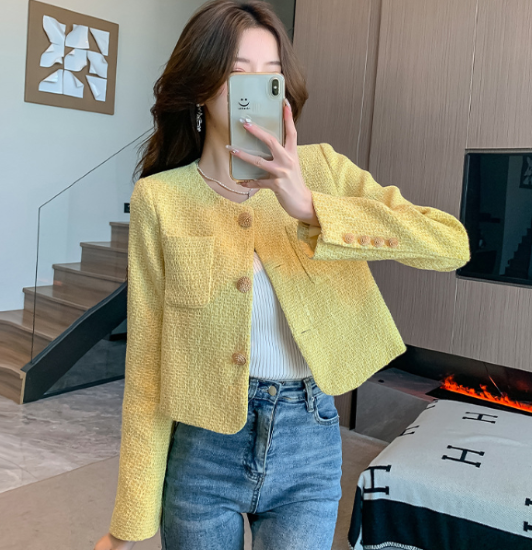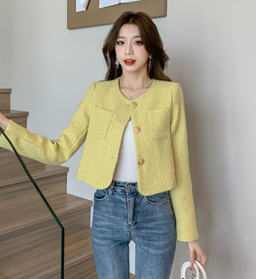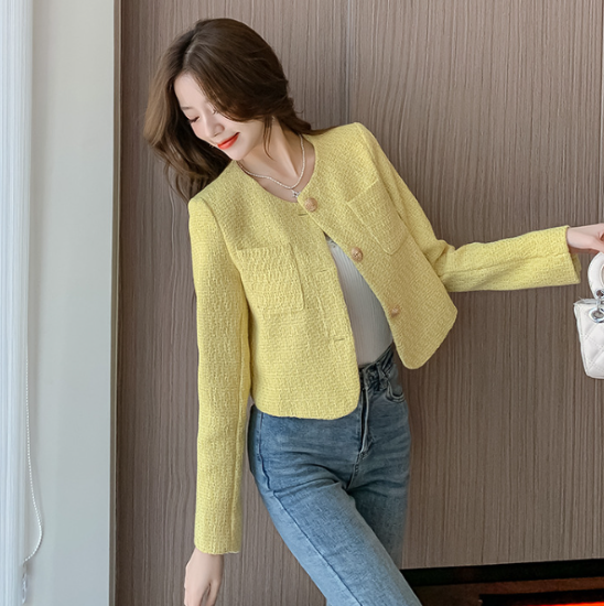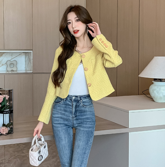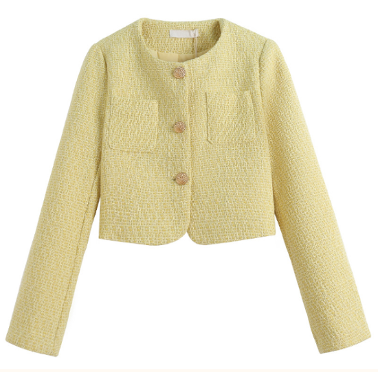 ジャケット レディース アウター 羽織 上着 長袖 ノーカラー ショート丈 ラウンドネック フロントボタン イエロー 黄色 ポケット カジュアル お出かけ おしゃれ きれいめ エレガント ファッション