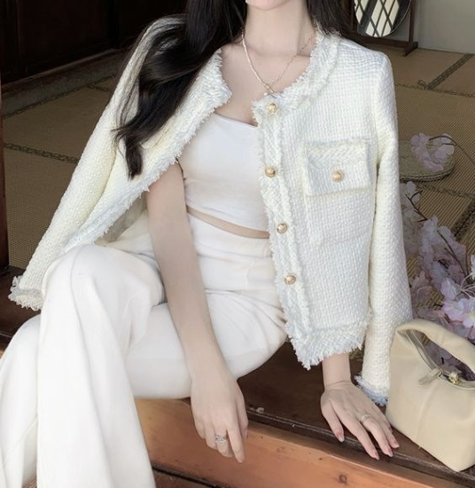 ジャケット レディース アウター 羽織 上着 ノーカラー 長袖 フロントボタン ツイード フリンジ 上品 大人っぽい きれいめ エレガント レトロ フォーマル お出かけ おしゃれ 白 ホワイト 女性