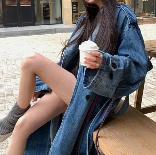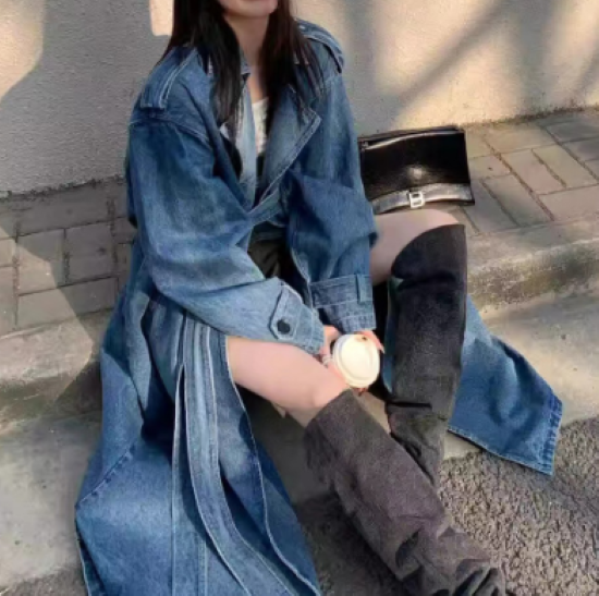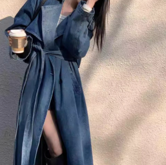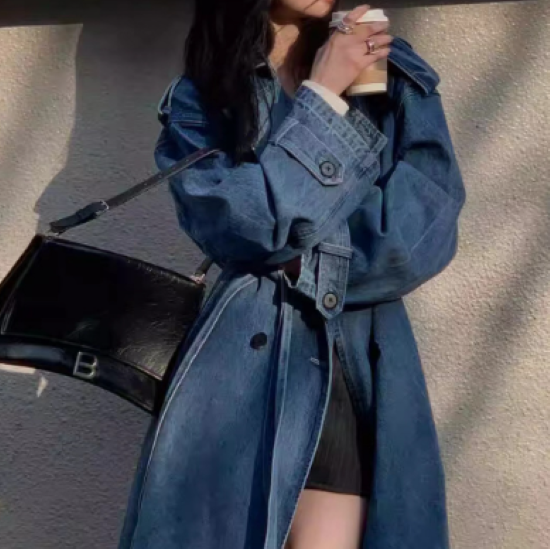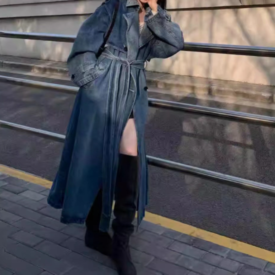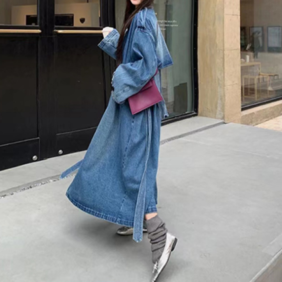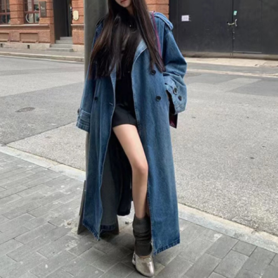 コート レディース アウター 羽織 上着 デニム ロング丈 長袖 襟あり ダブルブレスト ウエストベルト シンプル 無地 カジュアル お出かけ おしゃれ ブルー 青 スタイリッシュ ファッション