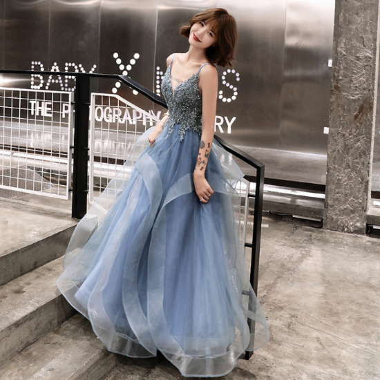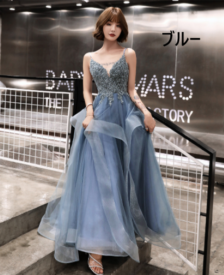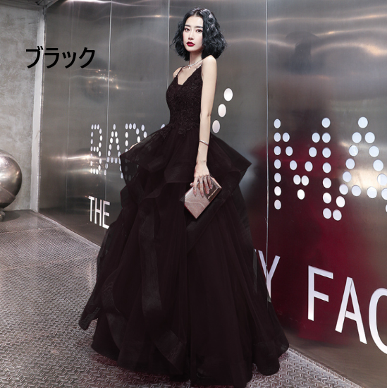 演奏会ドレス レディース 結婚式ドレス カラードレス パーティー ロング丈 ハイウエスト ノースリーブ Vネック 装飾 華やか ゴージャス ボリュームスカート プリンセス きれいめ エレガント 女性