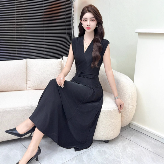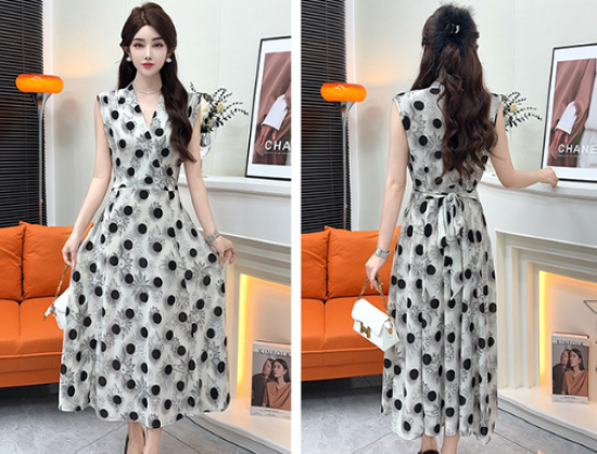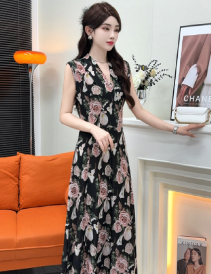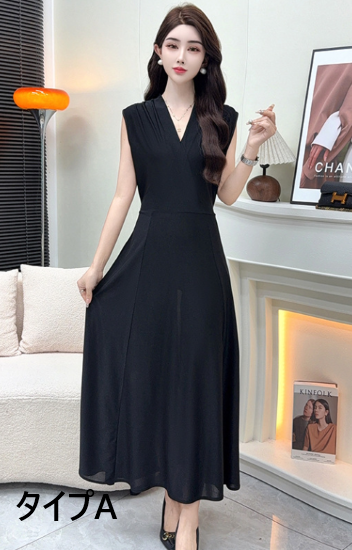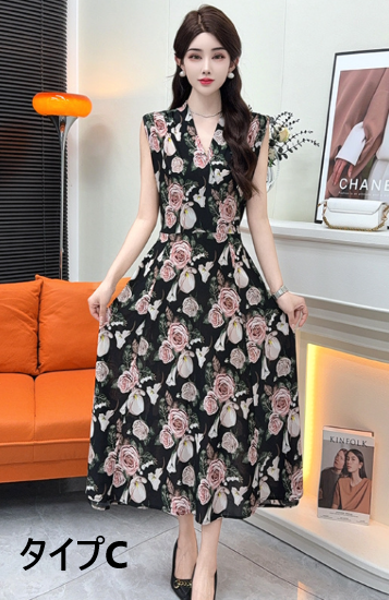 パーティードレス レディース 結婚式ドレス 演奏会ドレス ミモレ丈 ワンピース Vネック ノースリーブ ハイウエスト リボン きれいめ エレガント 上品 プリント 無地 お呼ばれ フォーマル 女性