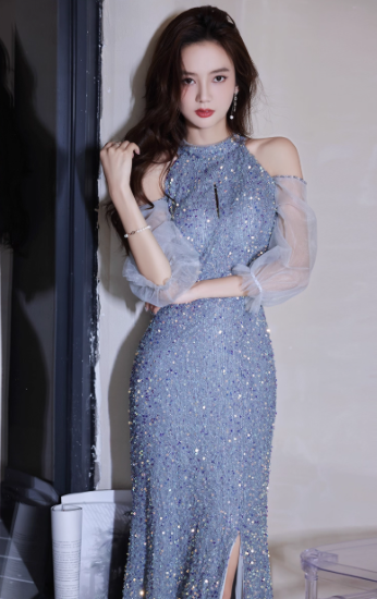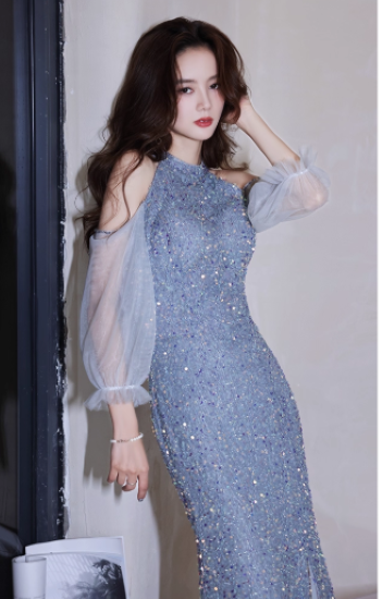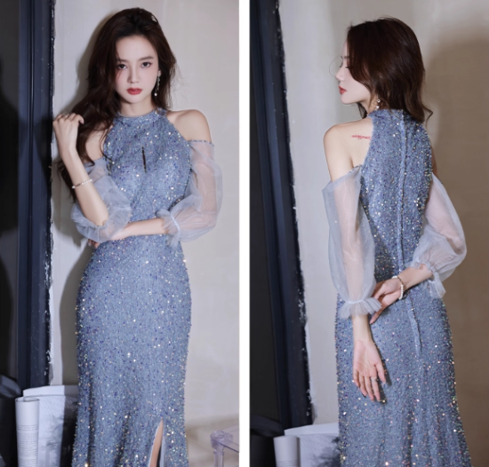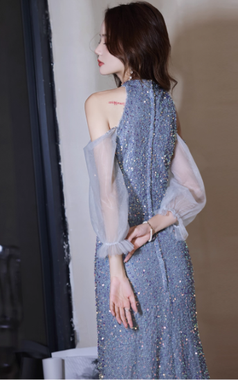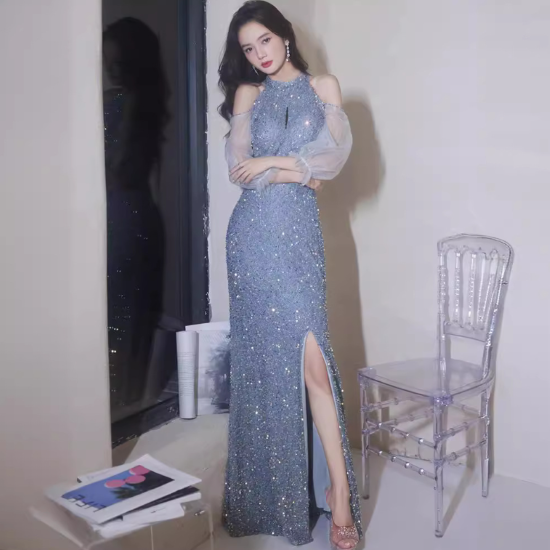 演奏会ドレス レディース 結婚式ドレス パーティードレス ロング ワンピース スパンコール きらきら 華やか スリット シースルー袖 肩出し きれいめ エレガント ゴージャス お呼ばれ フォーマル