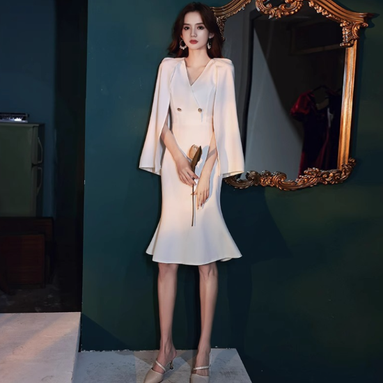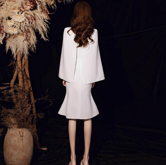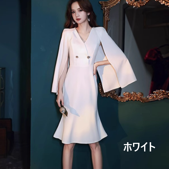 パーティードレス レディース 結婚式ドレス 演奏会ドレス ワンピース マーメイドライン Vネック ケープスリーブ スタイリッシュ きれいめ エレガント お呼ばれ フォーマル 女性 ファッション 白 黒