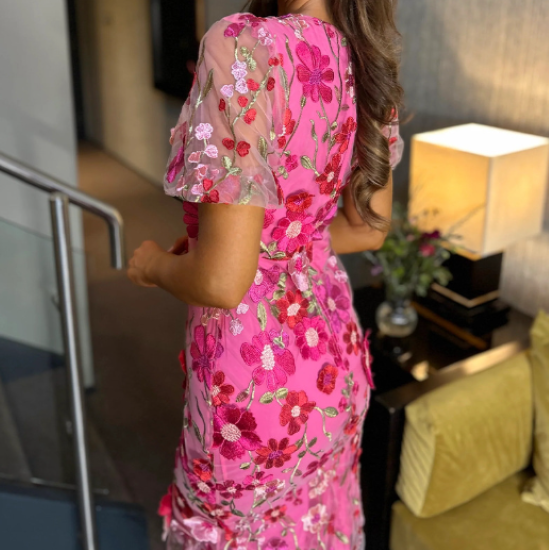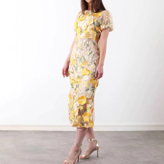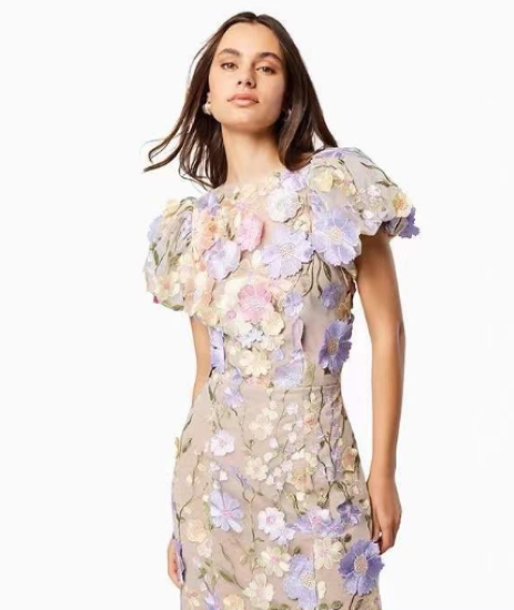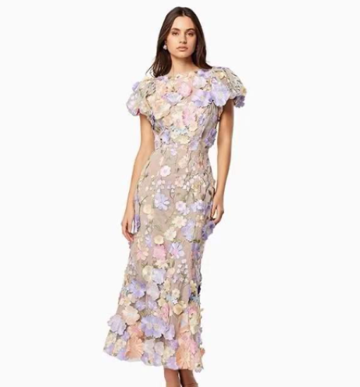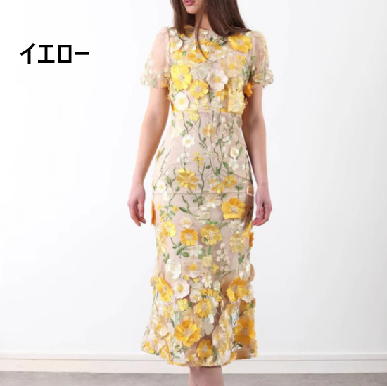 パーティードレス レディース 結婚式ドレス 演奏会ドレス ミモレ丈ワンピース フラワーモチーフ 花柄 半袖 華やか きれいめ エレガント お呼ばれ フォーマル ラウンドネック ハイウエスト 女性