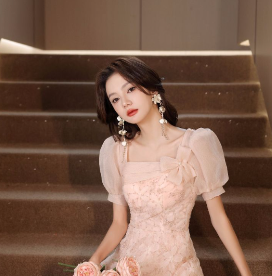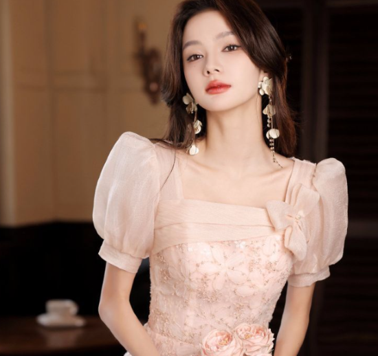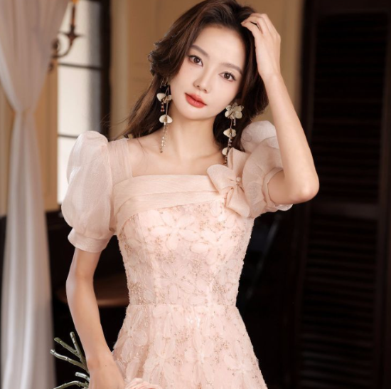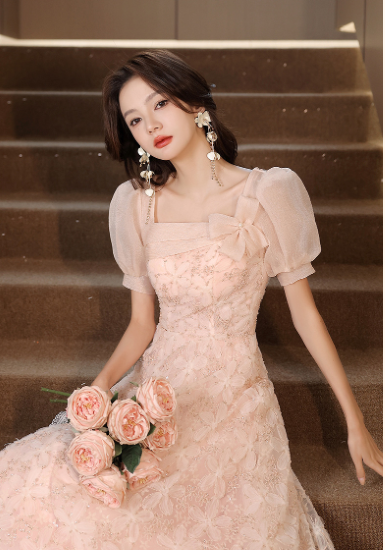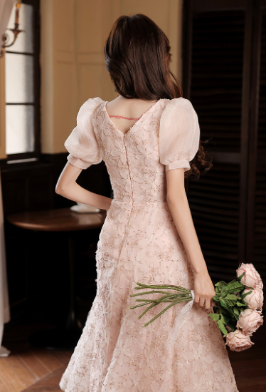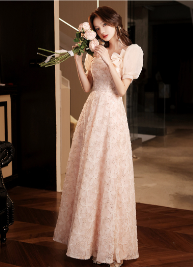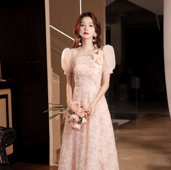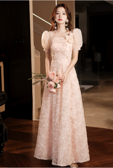 パーティードレス レディース 結婚式ドレス 演奏会ドレス ロング ワンピース パフスリーブ フェミニン ハイウエスト スクエアネック フラワーモチーフ きれいめ エレガント お呼ばれ フォーマル
