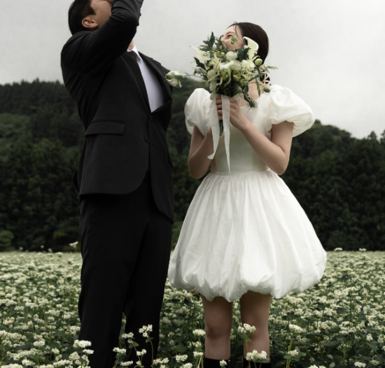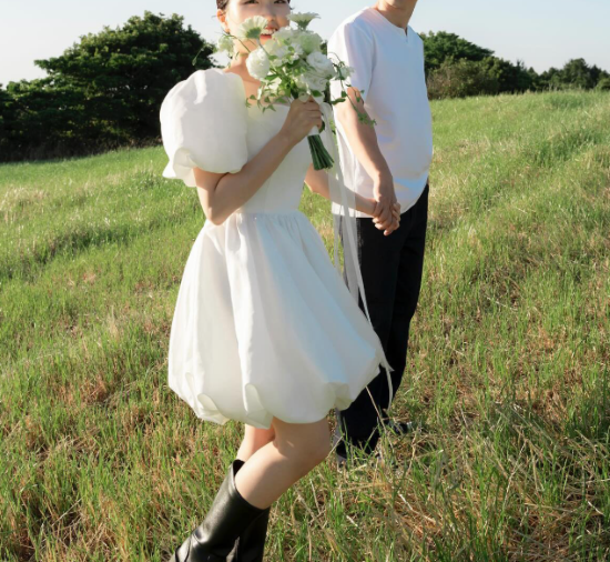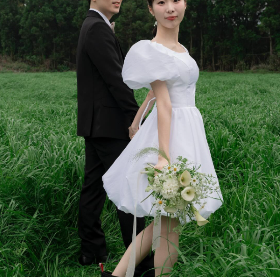 ウエディングドレス レディース 結婚式ドレス パーティードレス ブライダル 花嫁 ミニ丈 背中開き パフスリーブ バルーンスカート ふんわり ハイウエスト 脚長 スタイルアップ きれいめ エレガント
