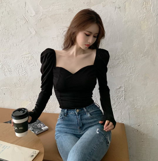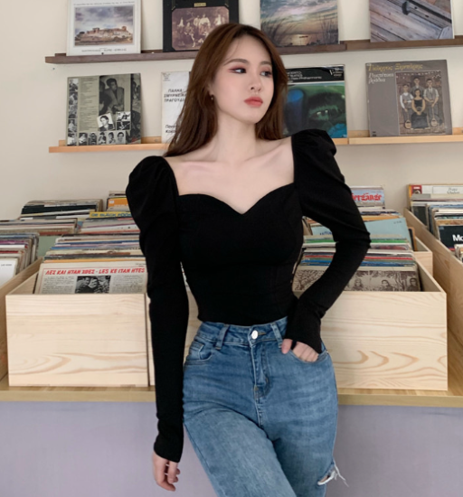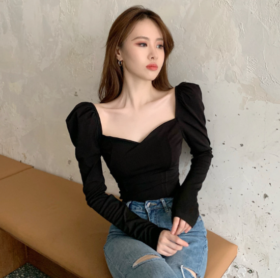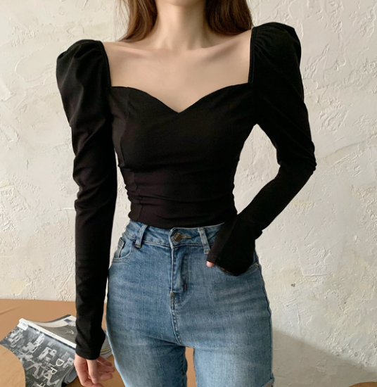 ニットセーター レディース トップス カットソー プルオーバー 長袖 パフスリーブ ハートネック 黒 ブラック 無地 スリム タイト カジュアル お出かけ おしゃれ きれいめ 女性 ファッション