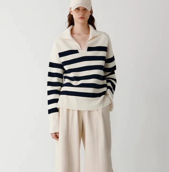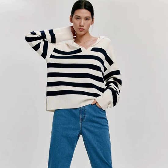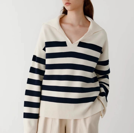 ニットセーター レディース トップス プルオーバー 長袖 ボーダー ストライプ バイカラー コントラストカラー 襟あり ポロ襟 ゆったり カジュアル お出かけ おしゃれ 女性 ファッション デイリー