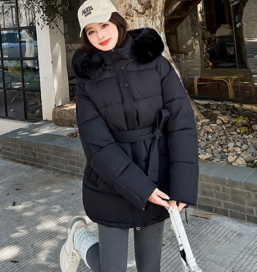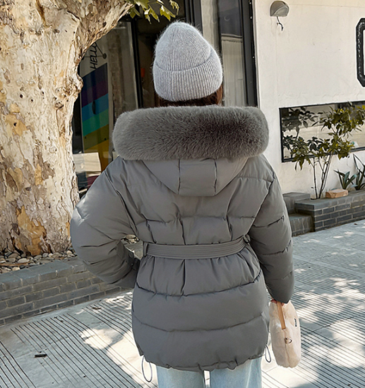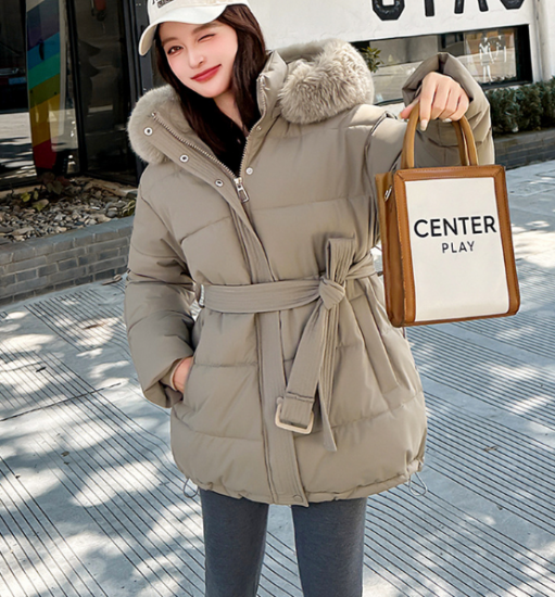 ジャケット レディース アウター 羽織 長袖 スタンドカラー フード付き ファー 防寒 防風 暖かい 冬 ウエストベルト ダウンジャケット フロントジッパー カジュアル お出かけ おしゃれ 女性