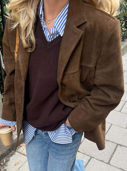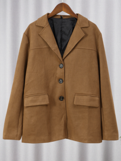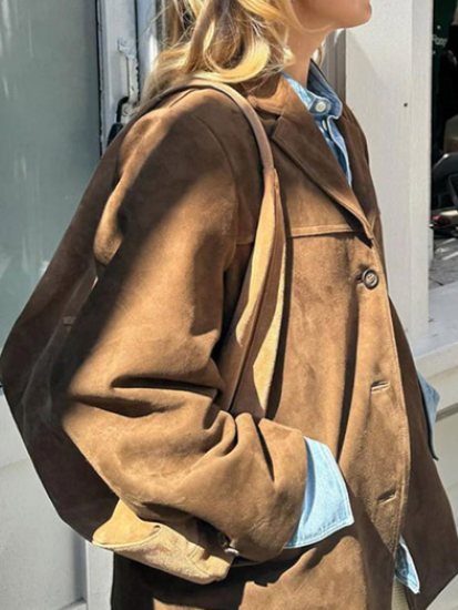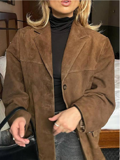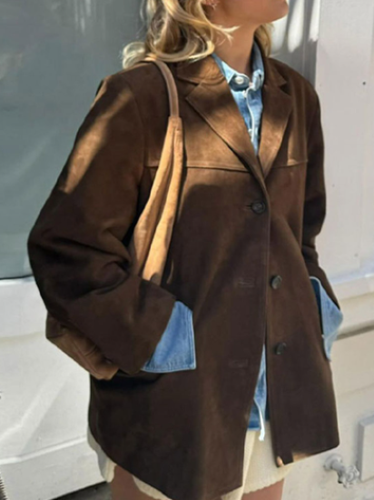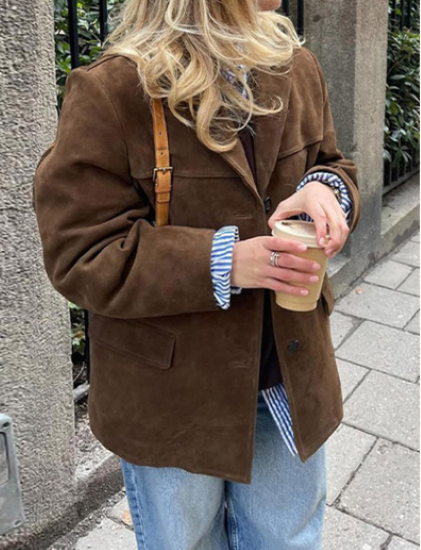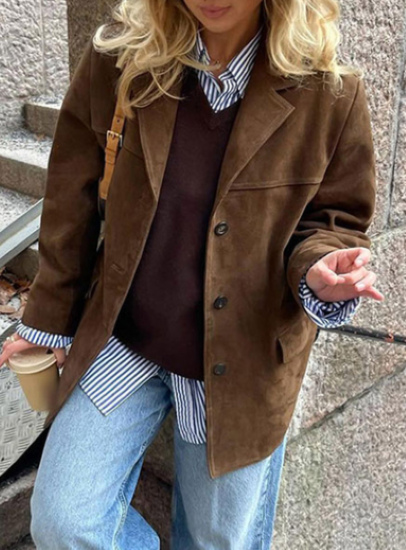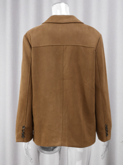 ジャケット レディース アウター 羽織 長袖 フロントボタン 襟あり スエード シンプル 無地 レトロ スタイリッシュ ブラウン 茶 カジュアル お出かけ おしゃれ 秋冬 女性 ファッション ポケット