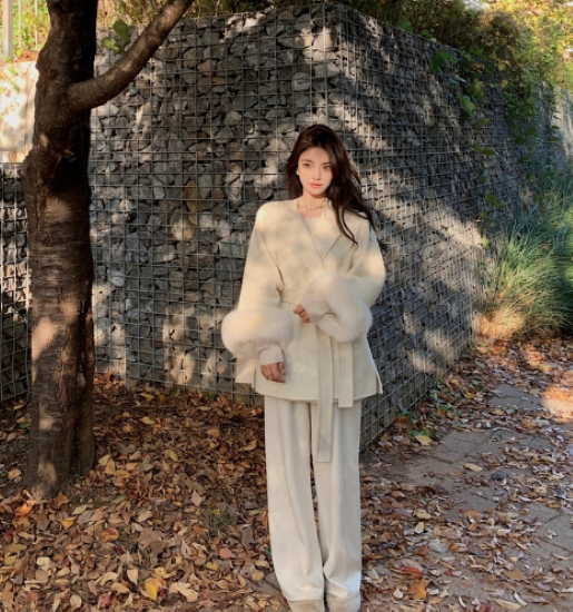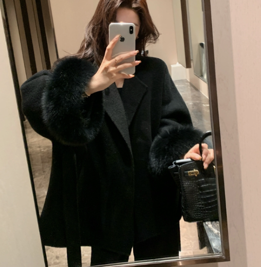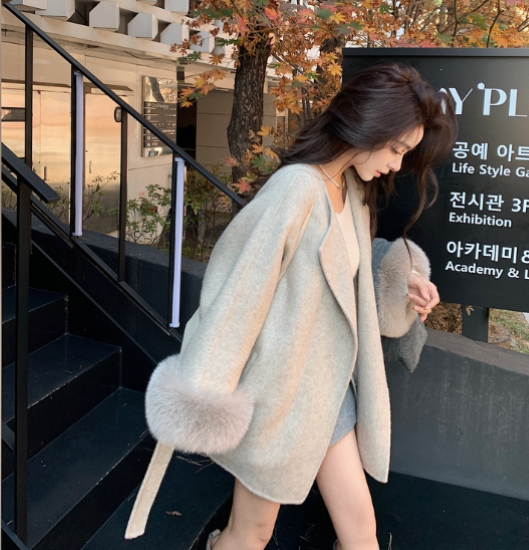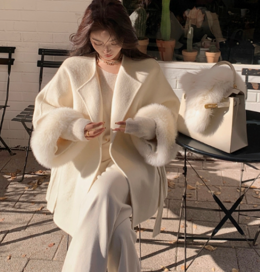 コート レディース アウター 羽織 上着 長袖 袖口ファー ゴージャス ノーカラー ウエストベルト シンプル 無地 ウールコート 防寒 冬 暖かい カジュアル お出かけ おしゃれ きれいめ エレガント