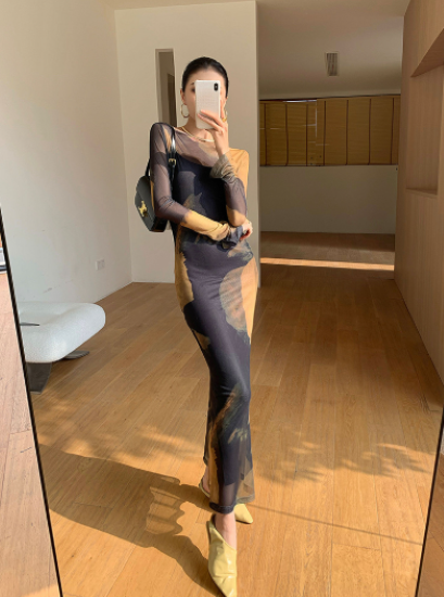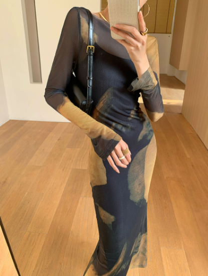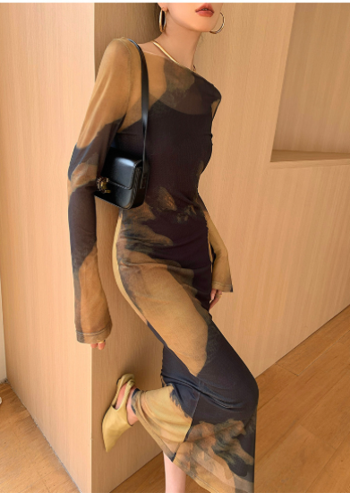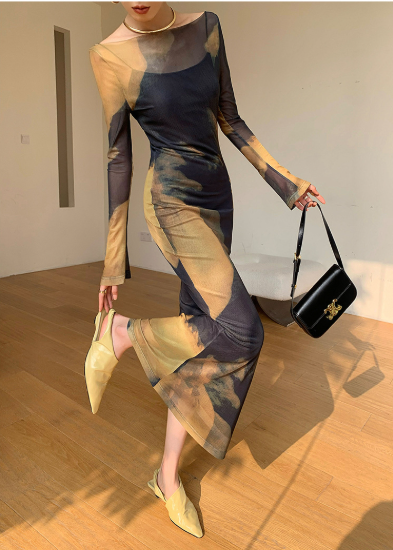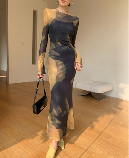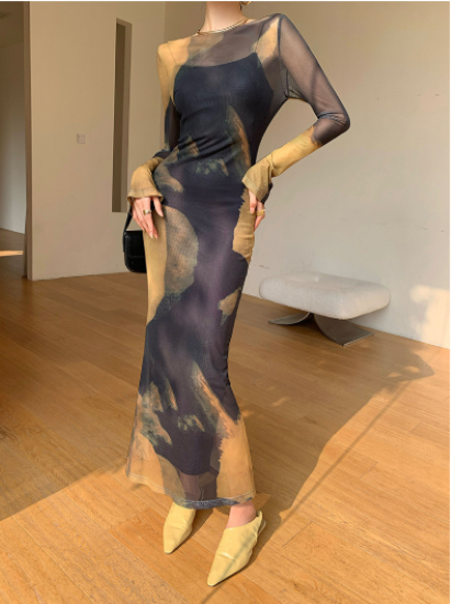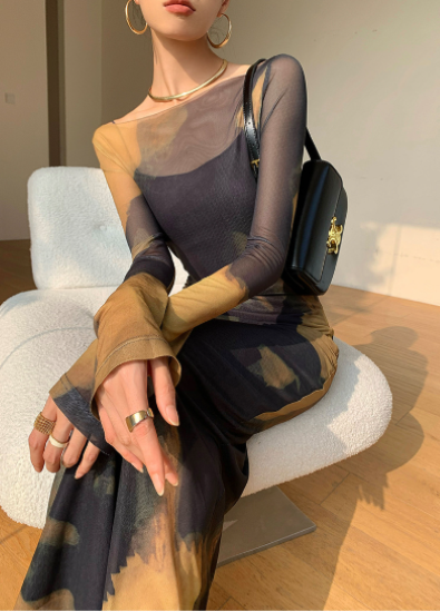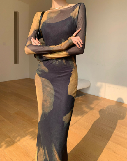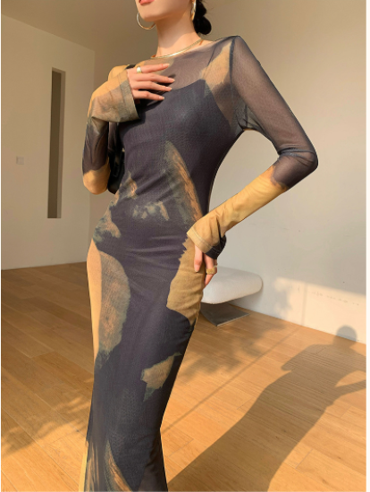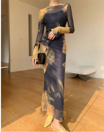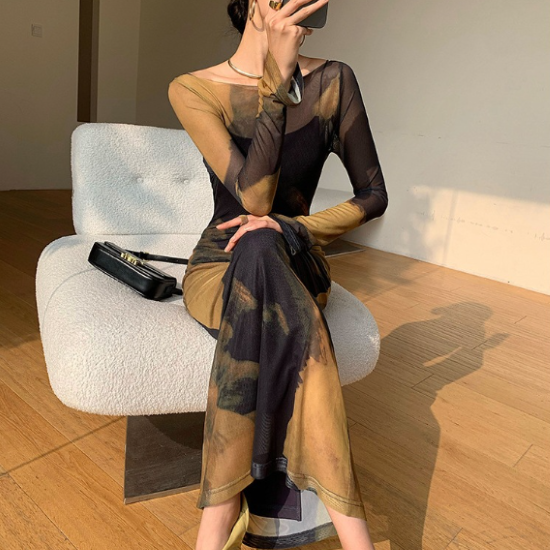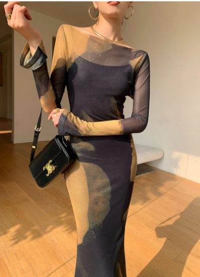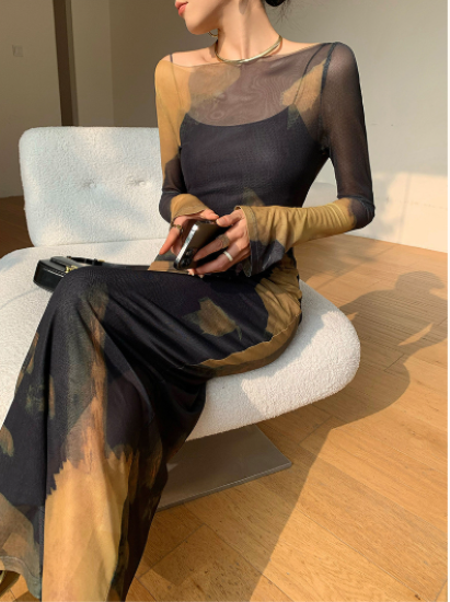 ワンピース レディース ロング丈 スリムフィット 長袖 ボートネック インナーキャミソール付き 2点セット ツーピース セミシアー きれいめ エレガント 大人っぽい 上品 お出かけ おしゃれ 女性