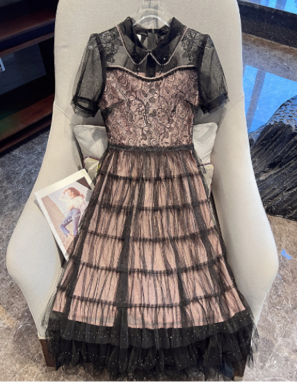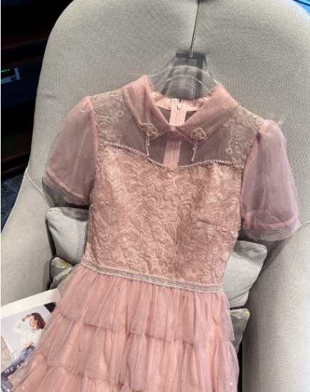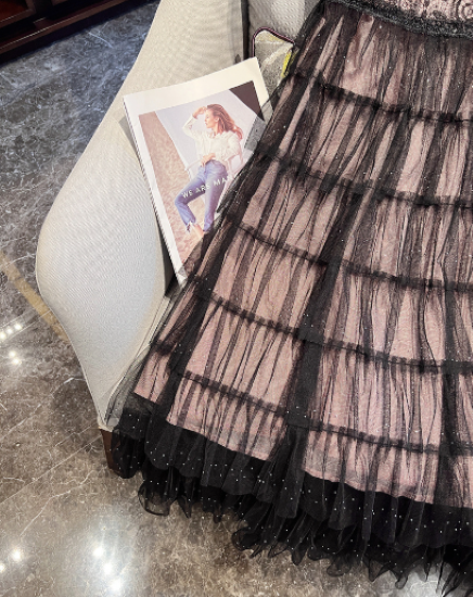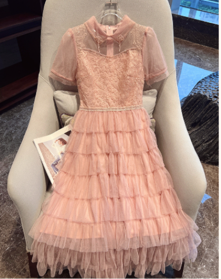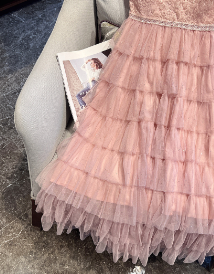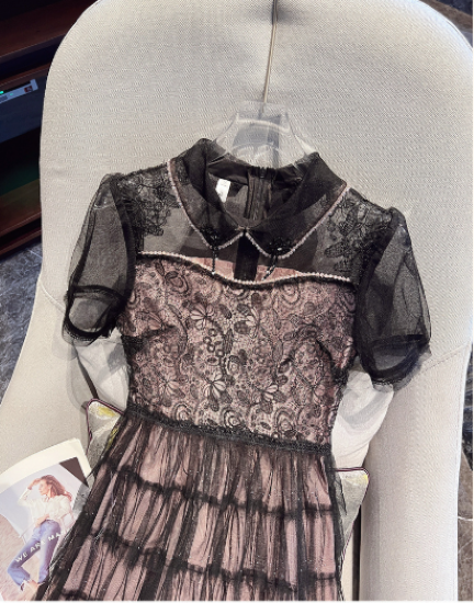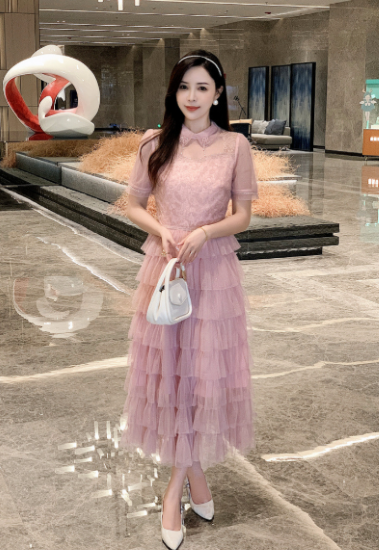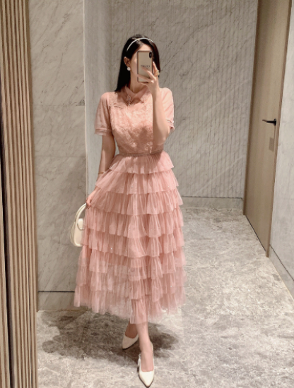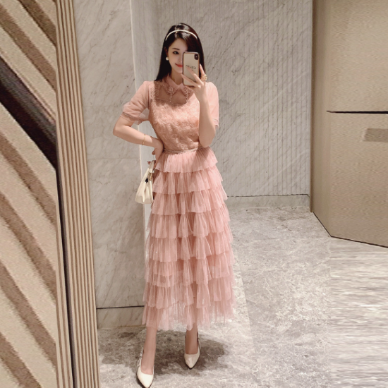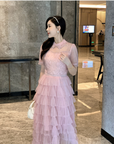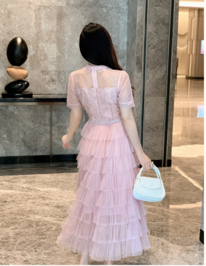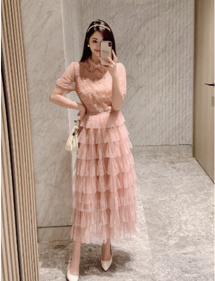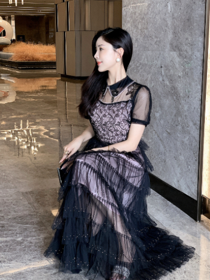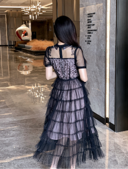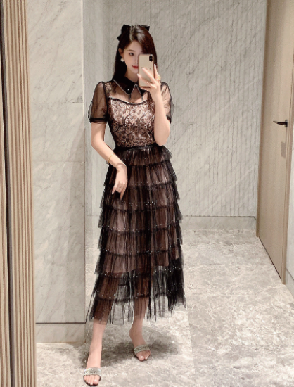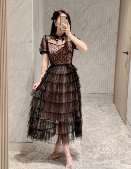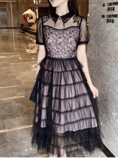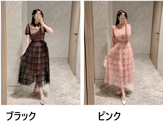 パーティードレス レディース 結婚式ドレス 演奏会ドレス ワンピース ミモレ丈 ティアードスカート メッシュ シースルー シアー 半袖 ハイウエスト きれいめ エレガント お呼ばれ フォーマル 女性