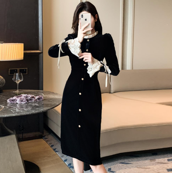 パーティードレス レディース 結婚式ドレス 演奏会ドレス ワンピース 黒 ブラック レース コントラストカラー バイカラー ベルベット リボン 上品 大人っぽい きれいめ エレガント フォーマル