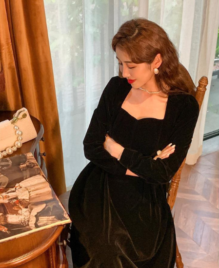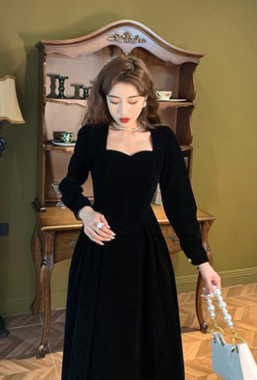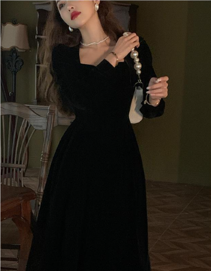 パーティードレス レディース 結婚式ドレス 演奏会ドレス ワンピース ロング ハイウエスト ベルベット シンプル ハートネック 長袖 ミモレ丈 上品 大人っぽい きれいめ エレガント フォーマル