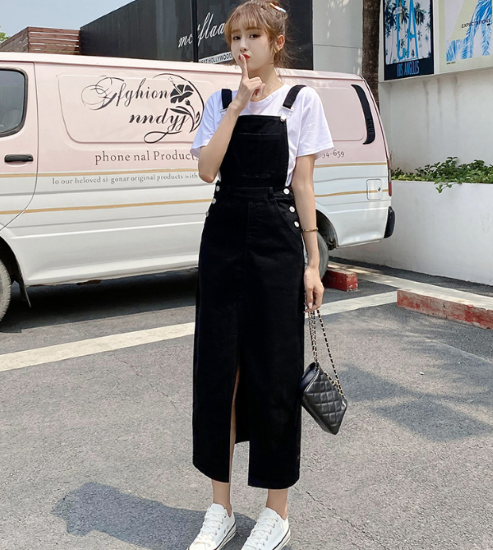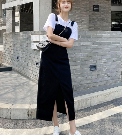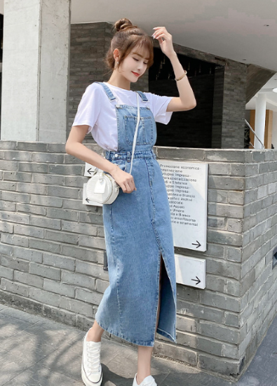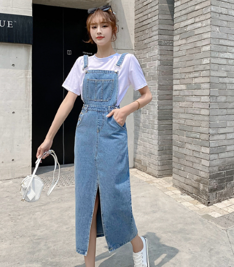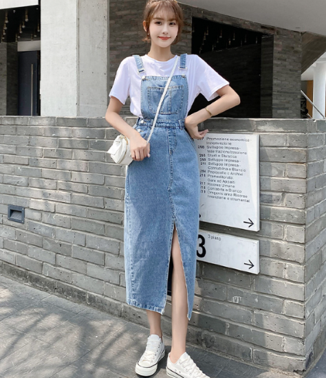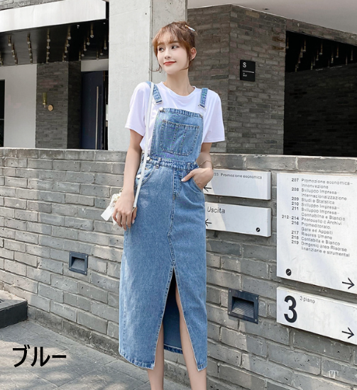 ワンピース レディース ミモレ丈 ジャンパースカート デニム ノースリーブ ハイウエスト ポケット フロントスリット 重ね着 レイヤード カジュアル お出かけ おしゃれ 女性 ファッション デイリー