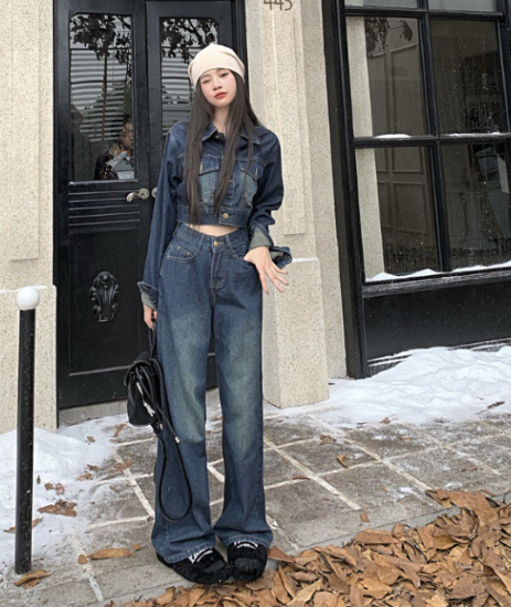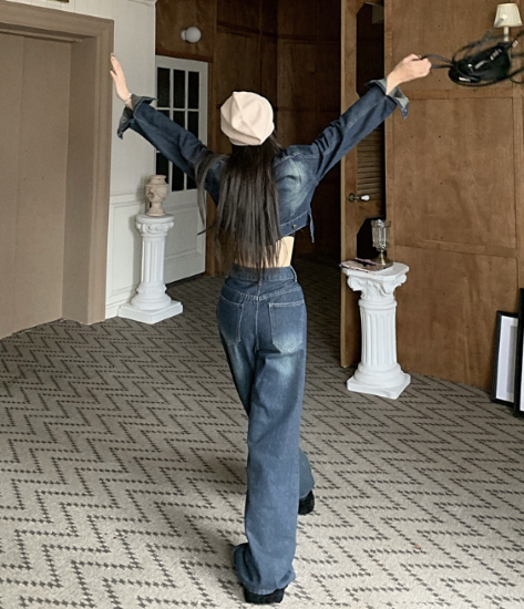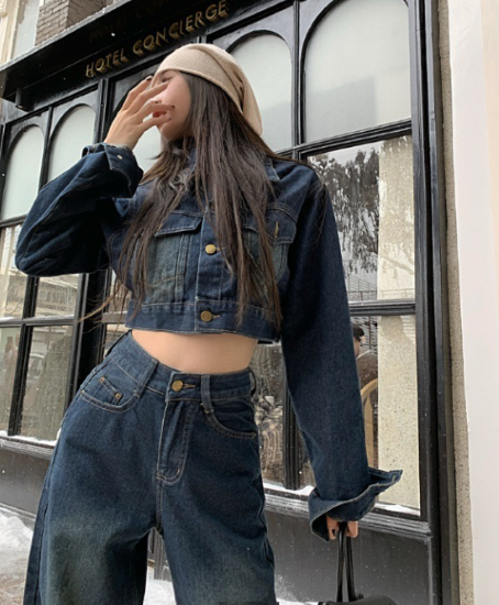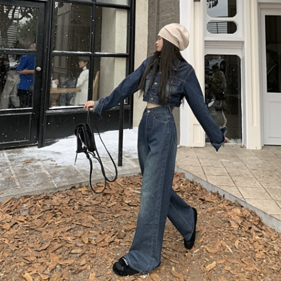 セットアップ レディース 上下セット 2点 ツーピース デニム ジャケット クロップド丈 長袖 フロントボタン ワイドパンツ ハイウエスト ジーパン カジュアル お出かけ おしゃれ スタイリッシュ