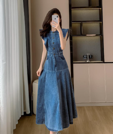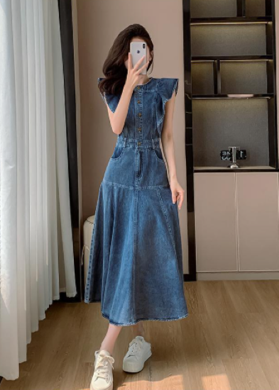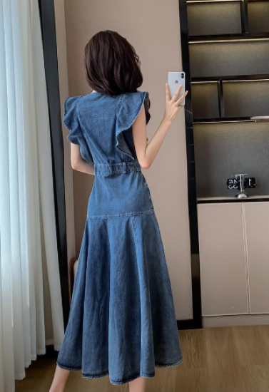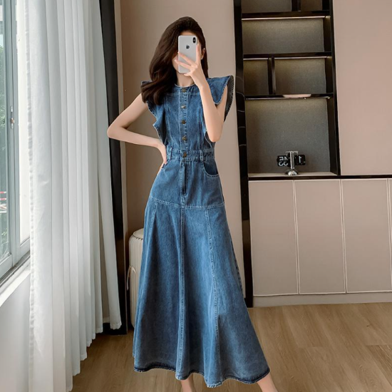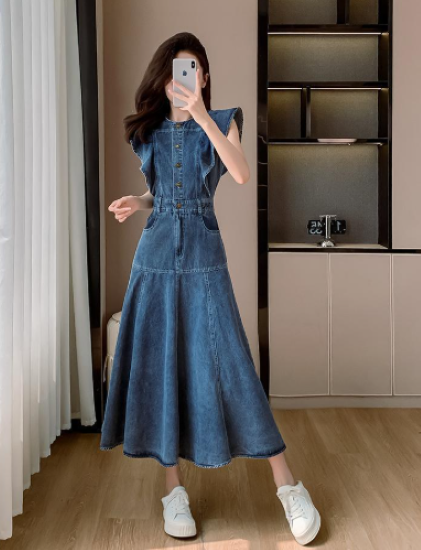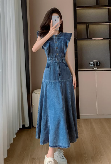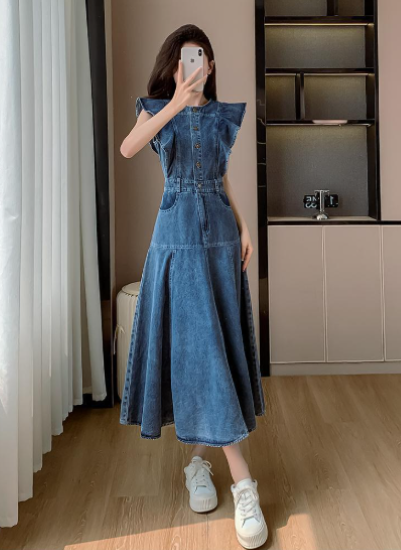 ワンピース レディース ロング丈 ノースリーブ フリルショルダー デニムワンピース ハイウエスト ラウンドネック カジュアル お出かけ おしゃれ きれいめ 春夏 ブルー 女性 ファッション デイリー