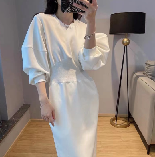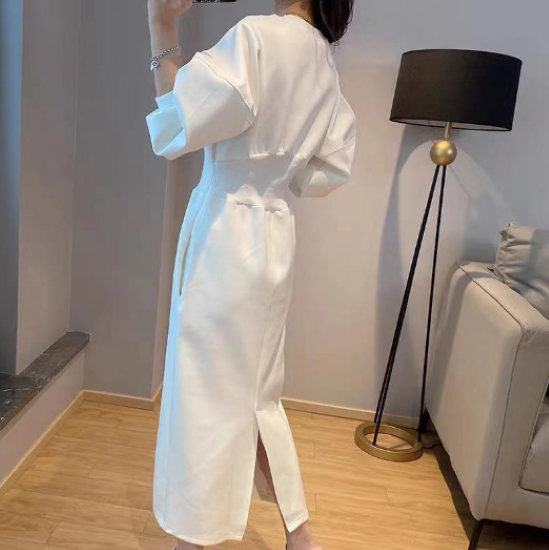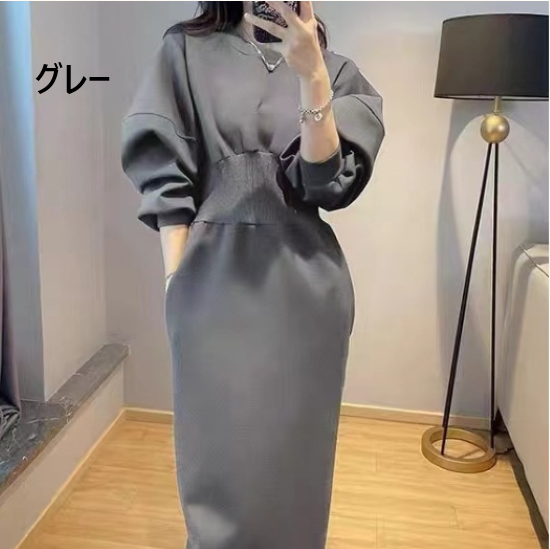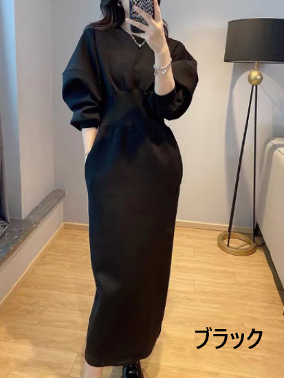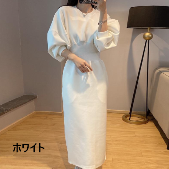 ワンピース レディース ロング丈 パフスリーブ ボリューム袖 ハイウエスト ラウンドネック シンプル 無地 コットン 綿 カジュアル お出かけ おしゃれ きれいめ エレガント 女性 ファッション