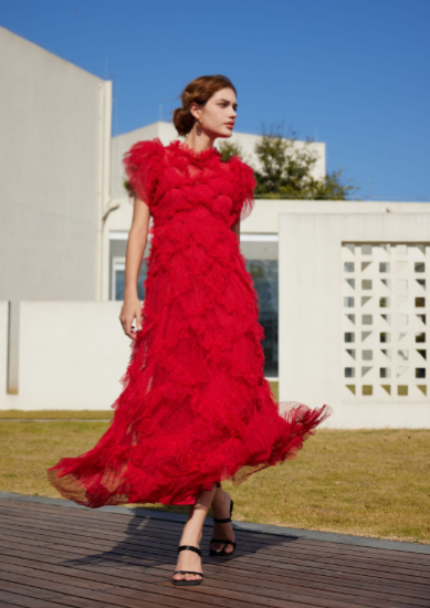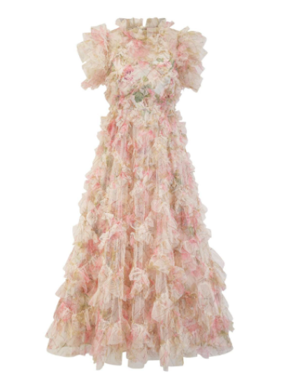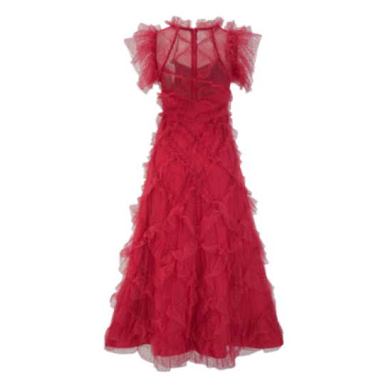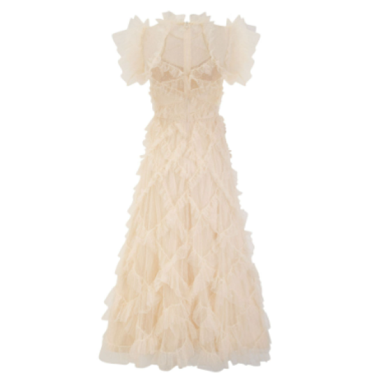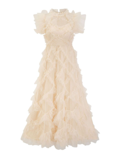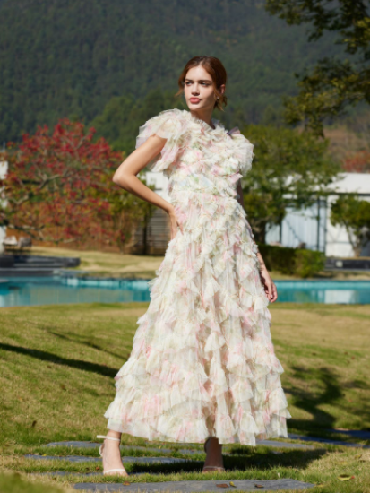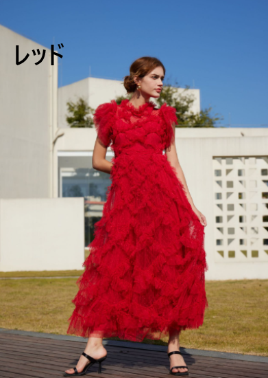 パーティードレス レディース 結婚式ドレス 演奏会ドレス ワンピース ロング丈 半袖 パフスリーブ フリル フェミニン ボリューム きれいめ エレガント お呼ばれ フォーマル ハイウエスト チュール