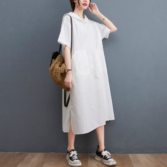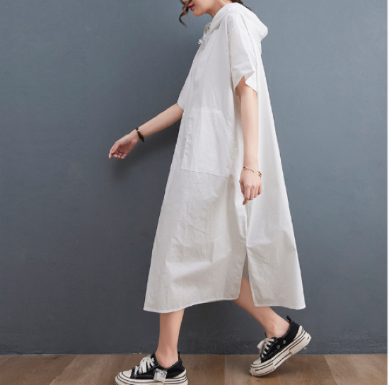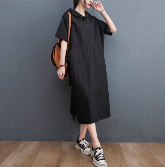 ワンピース レディース ロング丈 フード付き ゆったり オーバーサイズ 体型カバー シンプル 無地 ポケット リラックス サイドスリット コットンリネン 綿麻 カジュアル 半袖 お出かけ おしゃれ