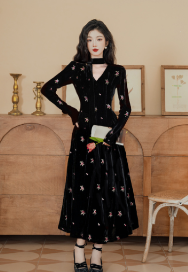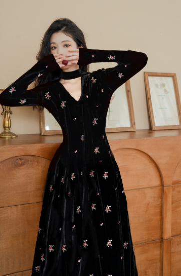 ワンピース レディース ロング丈 花柄 フラワー フローラル 長袖 Vネック ハイウエスト ベルベット 上品 レトロ 大人っぽい クラシカル きれいめ エレガント お呼ばれ フォーマル おしゃれ