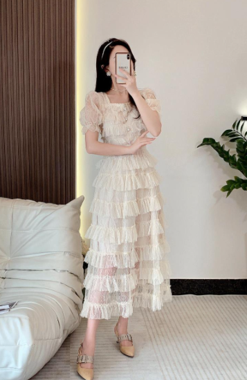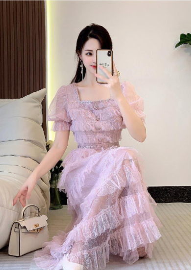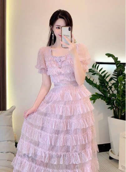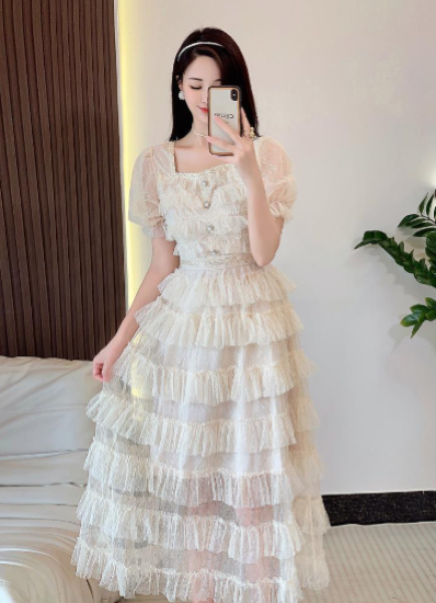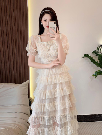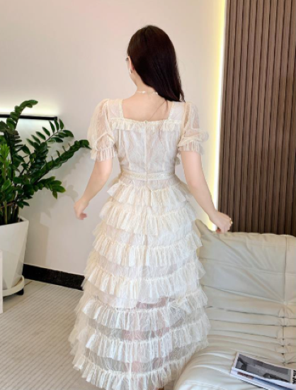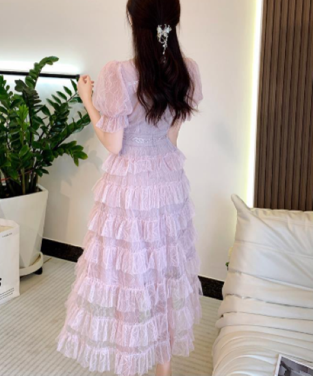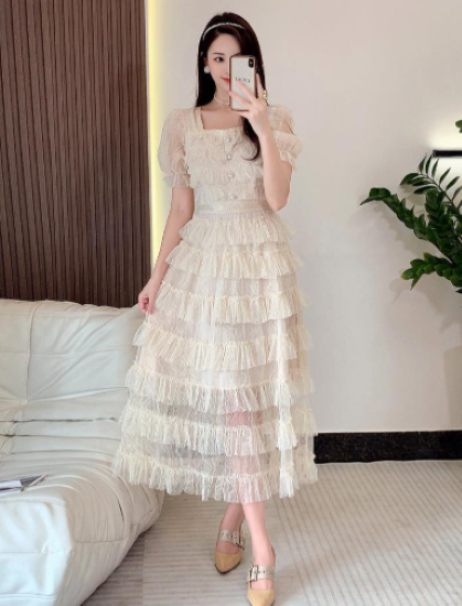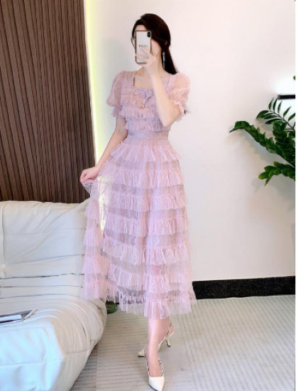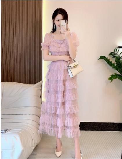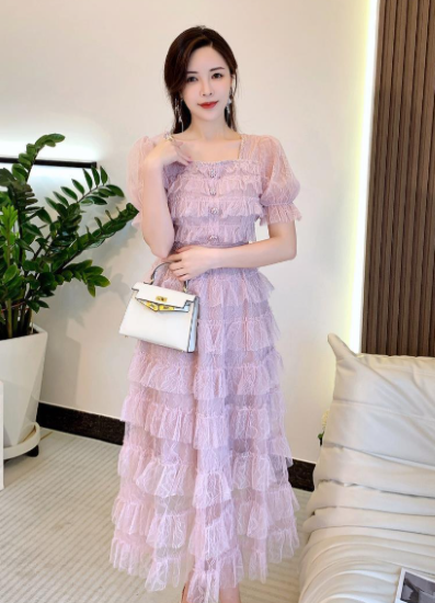 パーティードレス レディース 結婚式ドレス 演奏会ドレス ミモレ丈 ワンピース ティアードスカート ボリューム フリル 半袖 ハイウエスト きれいめ エレガント お呼ばれ フォーマル ファッション