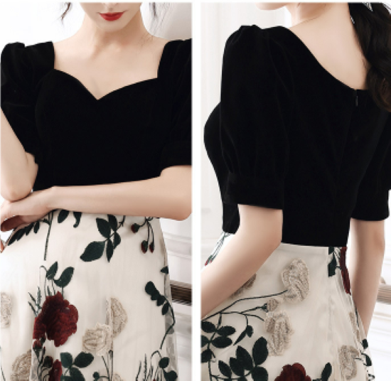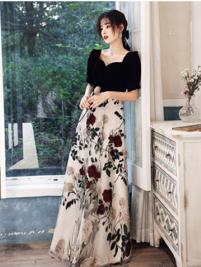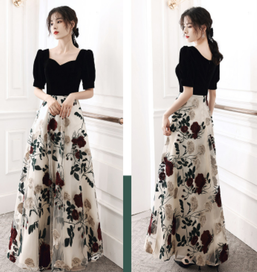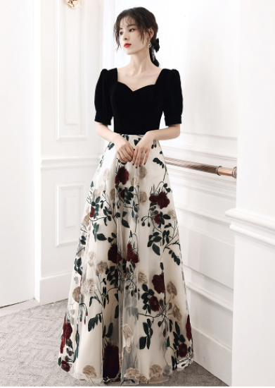 演奏会ドレス レディース 結婚式ドレス パーティードレス ロング丈 ワンピース ハートネック 半袖 ハイウエスト Aラインスカート 花柄 フラワー フローラルプリント きれいめ エレガント お呼ばれ