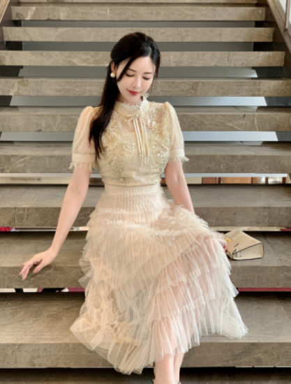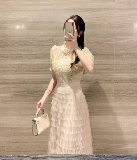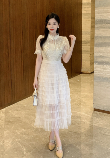 パーティードレス レディース 結婚式ドレス 演奏会ドレス ワンピース ミモレ丈 ティアードスカート フリル ハイウエスト 刺繍 メッシュ きれいめ エレガント お呼ばれ フォーマル ファッション
