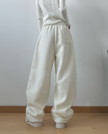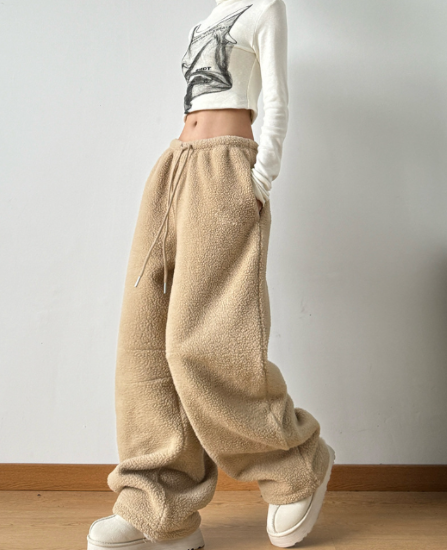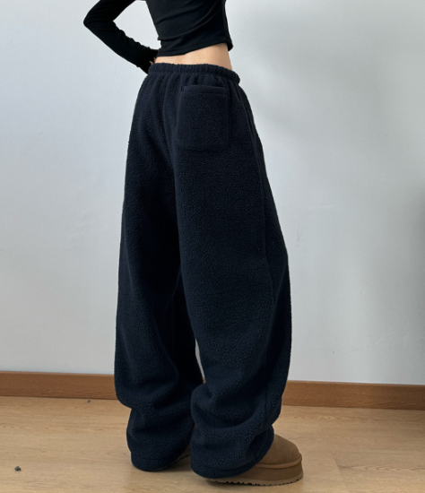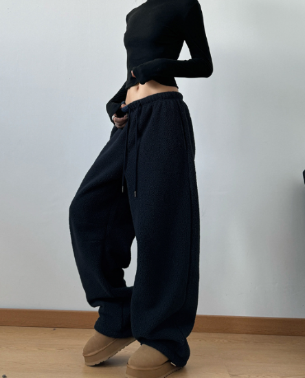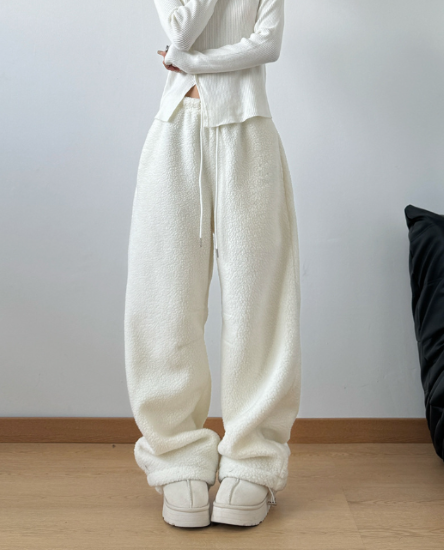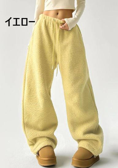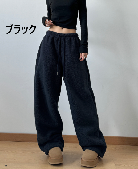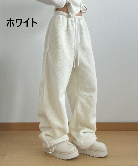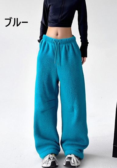 パンツ レディース ボトムス ワイドシルエット 長ズボン ゆったり ルーズ ロング フリース 暖かい 厚手 秋冬 ルームウェア シンプル 無地 ウエストドローストリング カジュアル お出かけ おしゃれ