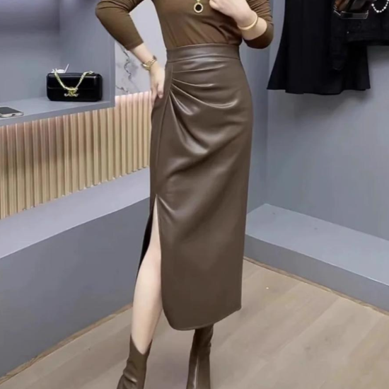 スカート レディース ボトムス ミモレ丈 ミドル丈 スリム タイト ハイウエスト スリット ドレープ シンプル 無地 モード スタイリッシュ PUレザー 大きいサイズ カジュアル お出かけ きれいめ