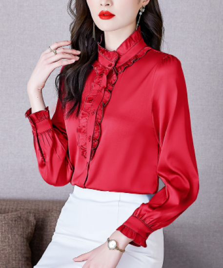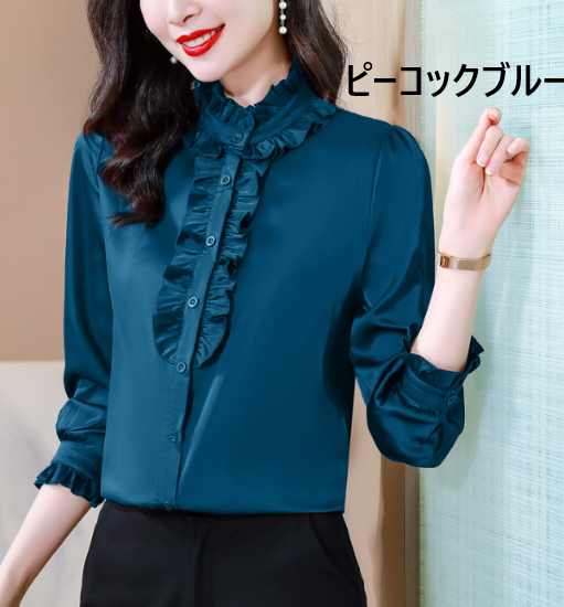 ブラウス レディース トップス シャツ フロントボタン スタンドカラー フリル 長袖 光沢 上品 大人っぽい きれいめ エレガント お出かけ おしゃれ お呼ばれ フォーマル 女性 ファッション OL