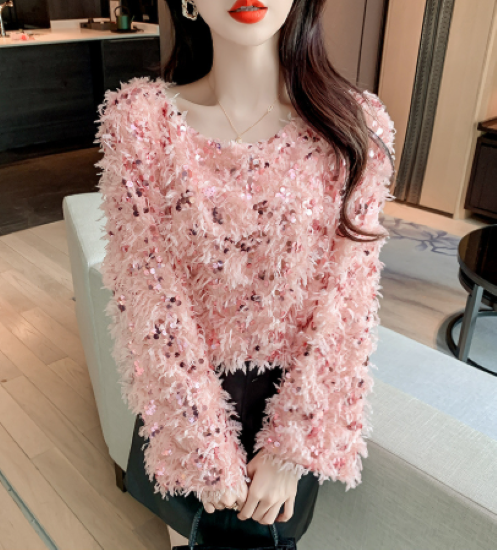 ニットセーター レディース トップス プルオーバー 長袖 スパンコール 装飾 華やか ゴージャス ふわふわ アプリコット ピンク きれいめ エレガント カジュアル お出かけ おしゃれ ファッション